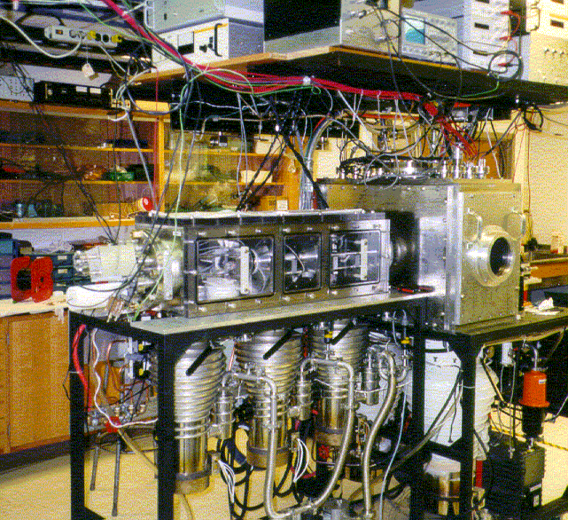 The picture below shows the instrument as constructed in the Group's original laboratory in the Chemistry Building. The instrument has since been disassembled and the various high-vacuum chambers have been utilized for newly-designed instrumentation. The modular design of these instruments, however, does allow us to quickly rebuild or re-purpose all of our drift tubes and high-vacuum chambers for a variety of instrumental configurations.