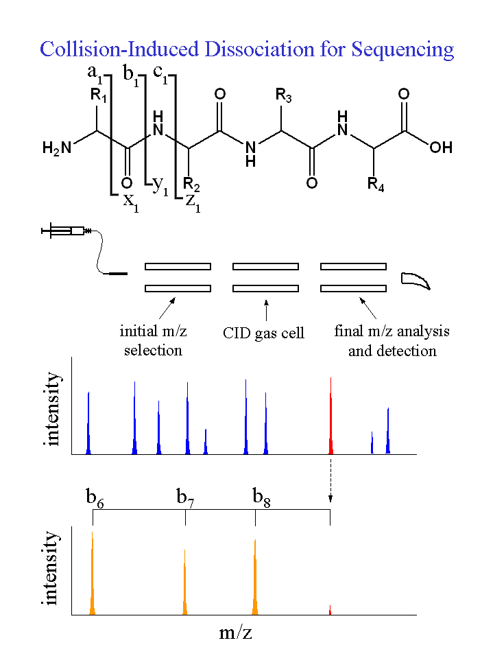 Collision induced dissociation (CID) of molecular ions is an important approach for determining information about sequence. For a large mixture of ions, the initial step of mass selecting a parent ion introduces an intrinsic inefficiency to the CID process. For example, below we show an example where ten parent ions are analyzed by MS/MS in a triple quadrupole instrument. During the selection of an individual parent ion, the other nine parents are discarded — thus, the experimental efficiency is ~10%. For larger mixtures, this efficiency can be even less. For example, for complete analysis of a mixture of 500 parent ions (where each ion is selected individually) the efficiency is only about 0.2%. In the field of proteomics, where information about large numbers of proteins is required, such limitations can become significant.