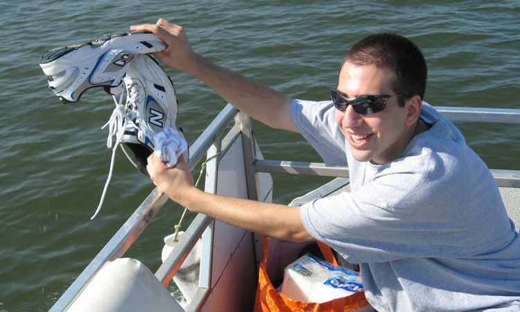 A man holding up shoes on a boat