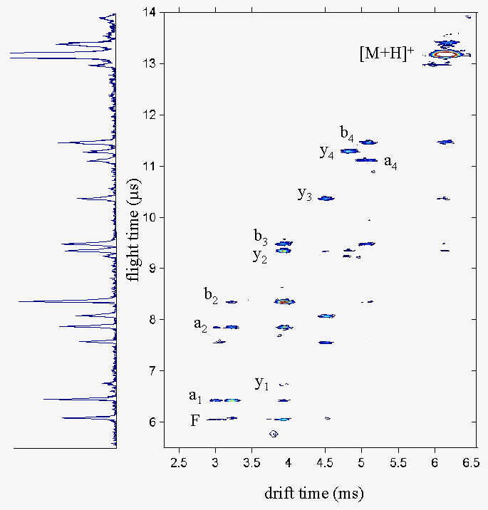 An example dataset recorded for D-Ala2,3 methionine enkephalin is shown below. In this case, some fragments (e.g., b3 and y3) are formed upon injection of the ions into the drift tube. Other fragment ions are mobility-labeled with the drift time of their precursor.